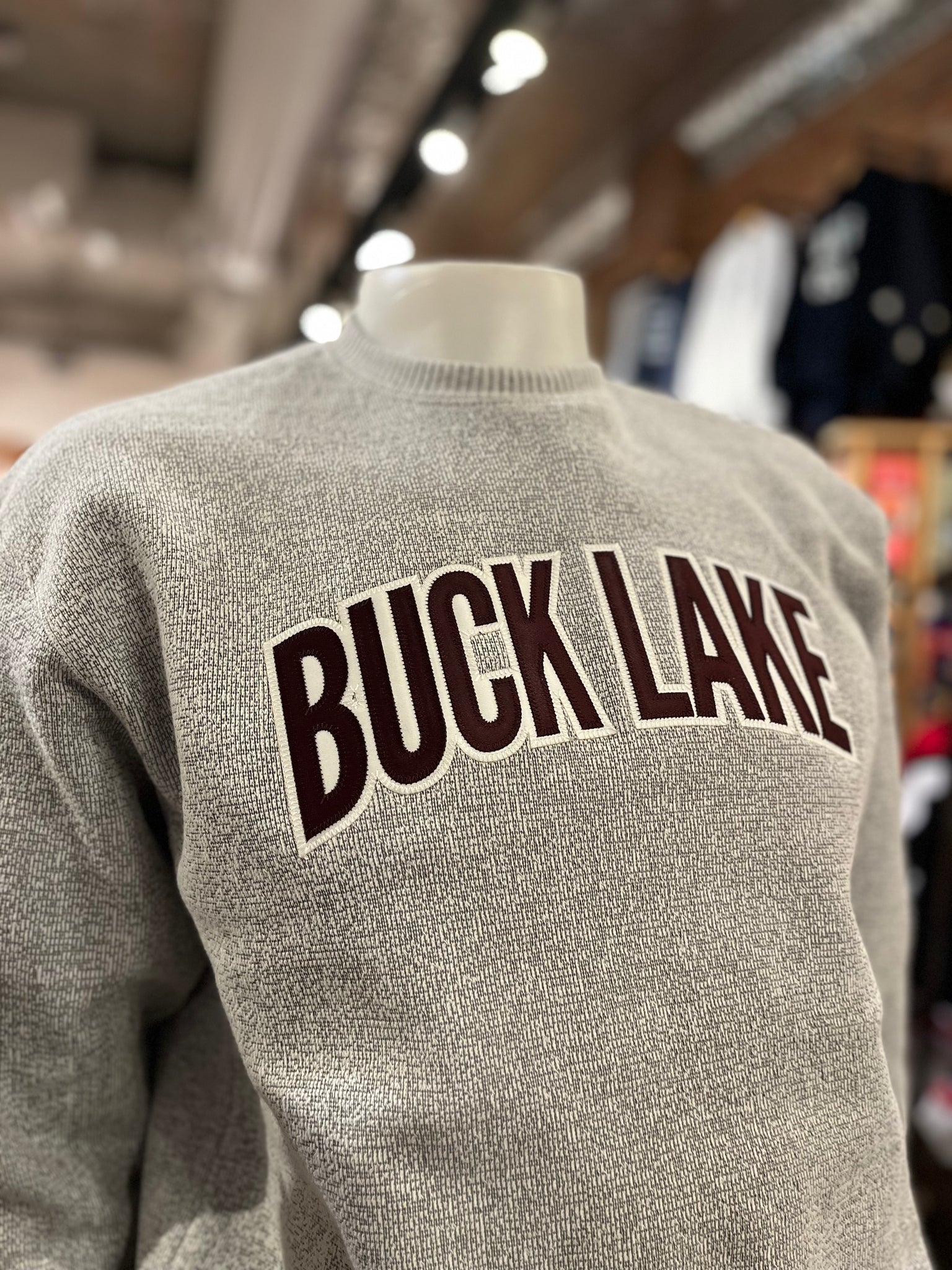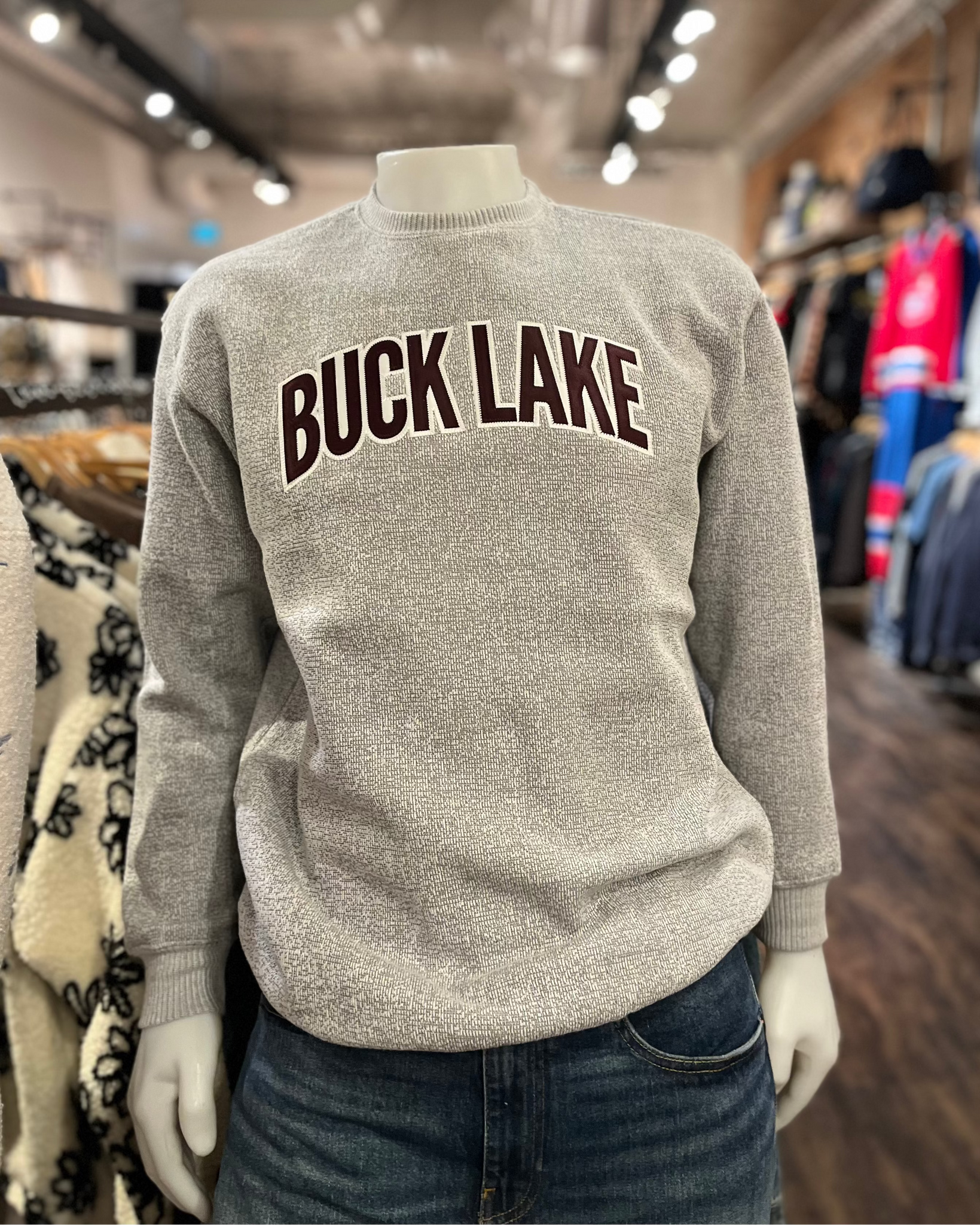 Twill crew neck with Buck Lake embroidery. Sleeves and waist are slightly cuffed. Unisex fit.