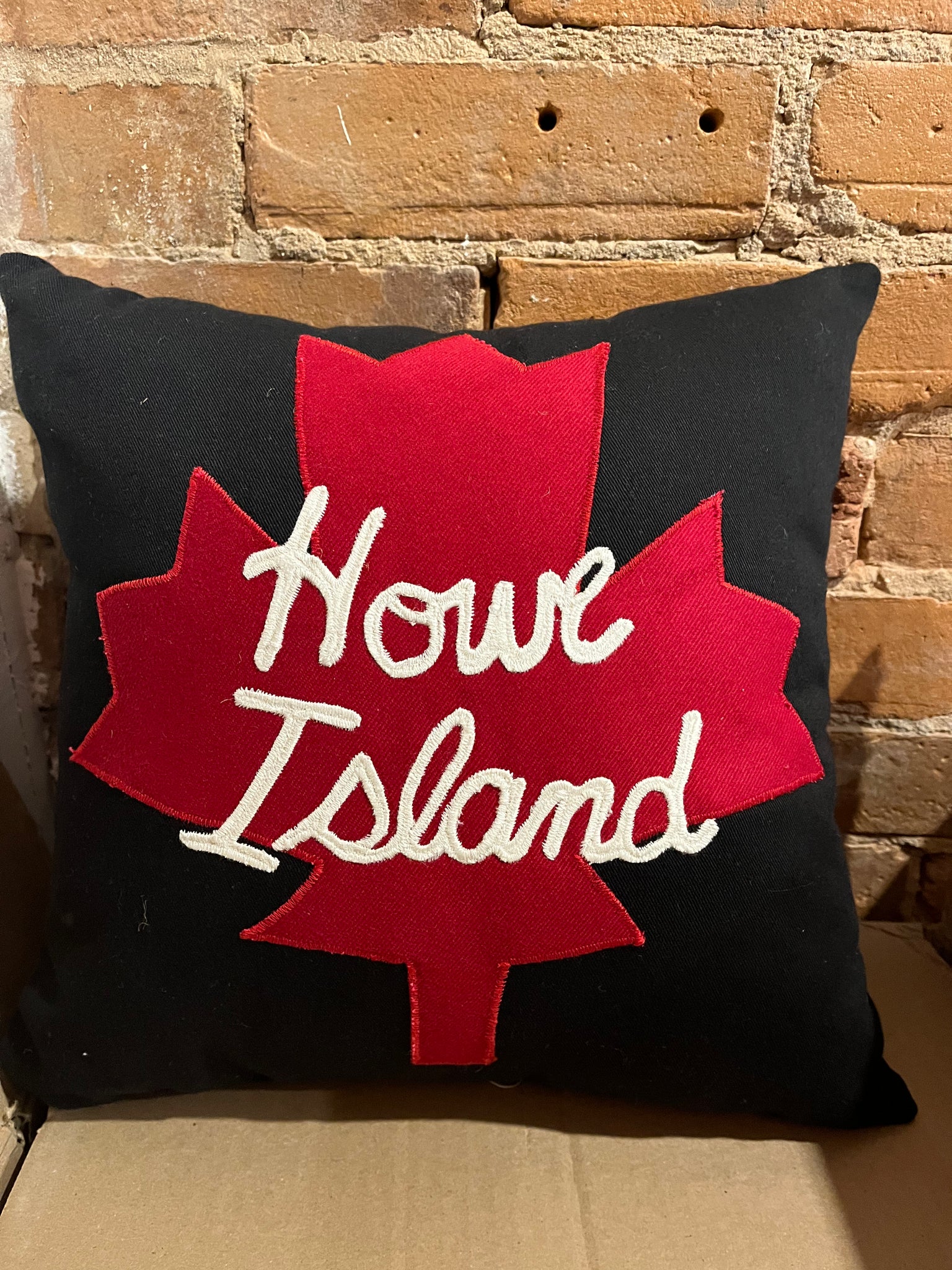 Howe Island maple leaf pillow, handmade in Canada.